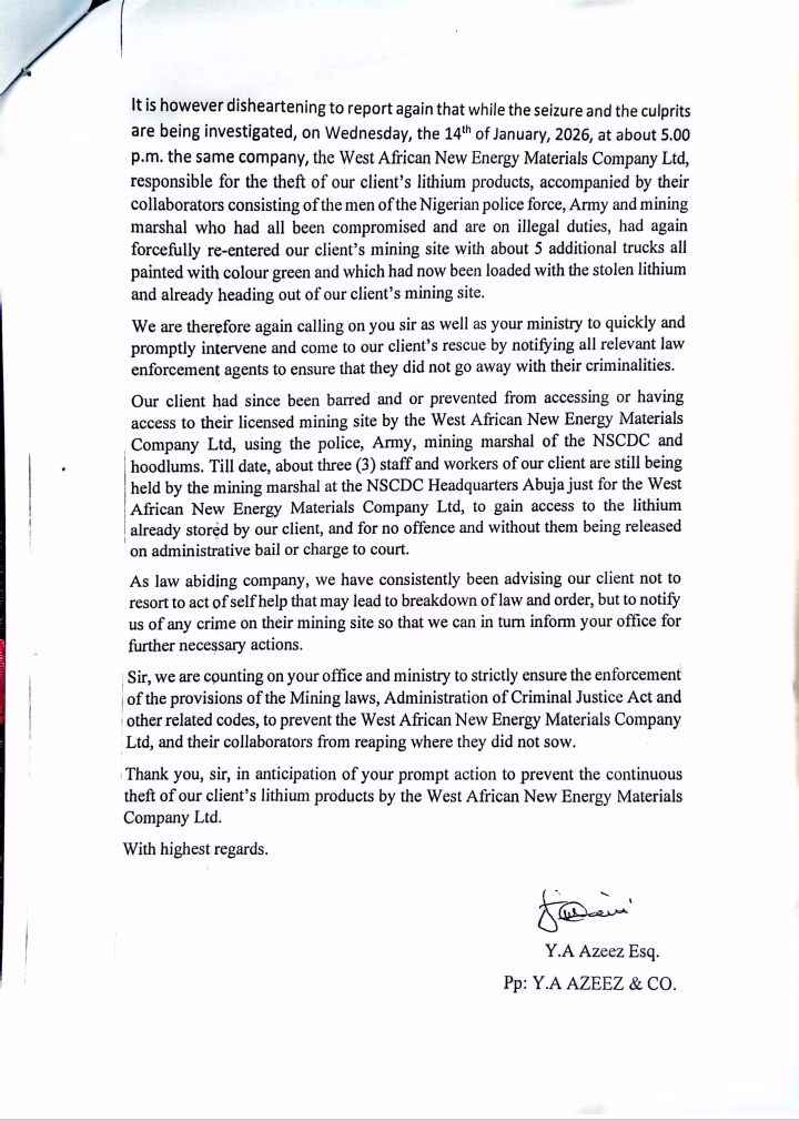 The petitions, dated January 12 and 15, 2026, were written by the firm’s counsel, Y.A. Azeez (Esq.), who alleged that officials of West Africa New Energy Material Company, “in connivance with men of the Nigeria Police Force, the Nigerian Army and mining marshals,” invaded the site and carted away large quantities of lithium ore.