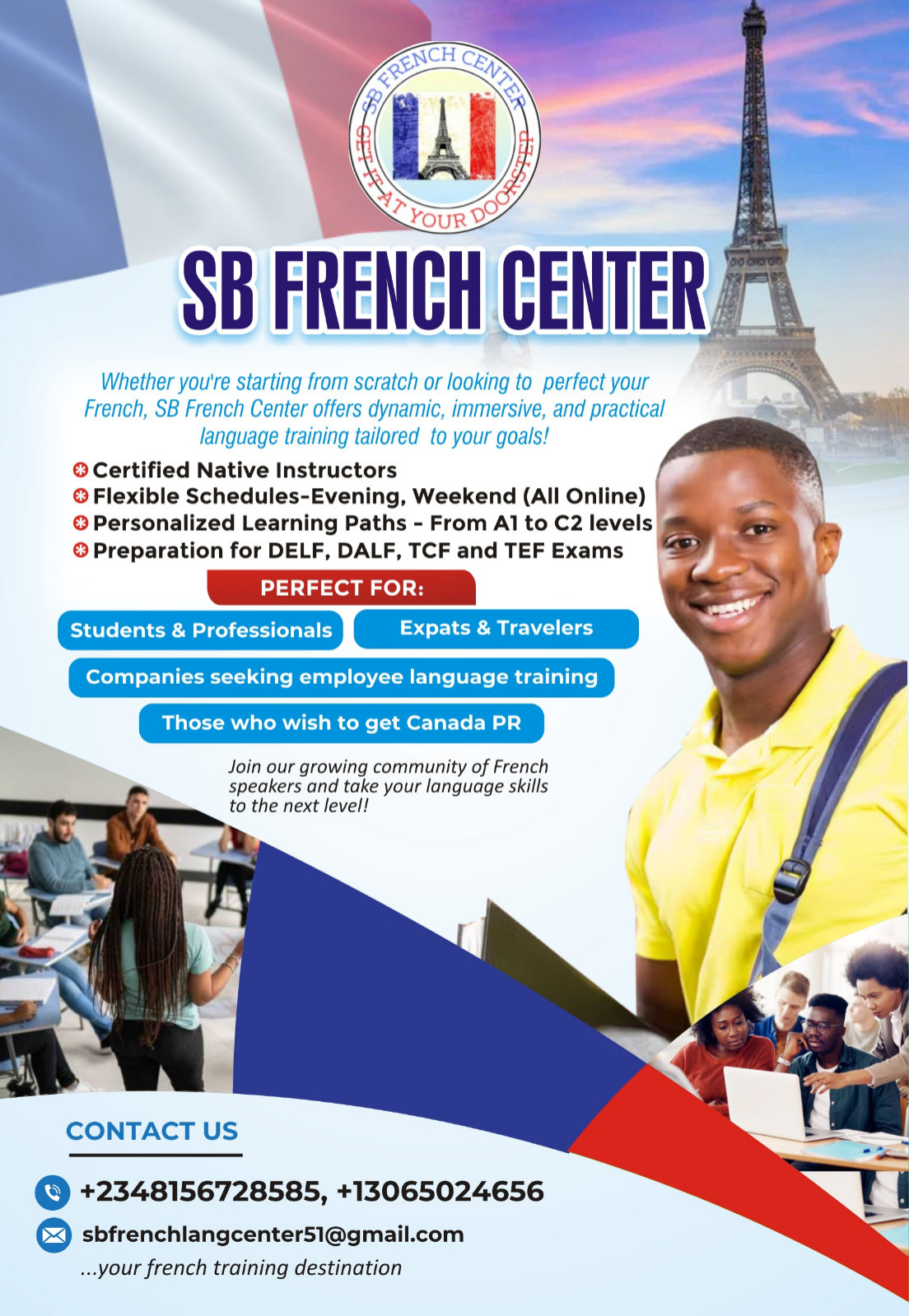 Phone/WhatsApp: +2348156728585, +13065024656, Email: sbfrenchlangcenter51@gmail.com